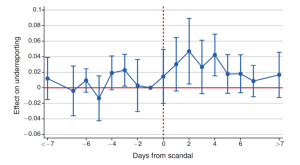 The authors identify the days when news of public officials’ corruption spread widely throughout society. The results are insightful, as evidenced by this graph. On the X axis, 0 represents the date when the corruption was made public. The Y axis represents the likelihood that a customer will underreport her purchase.
